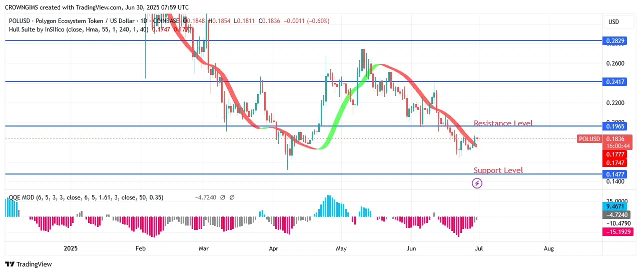 Bears are dominating the market when POL is trading below the Hull Suite crypto signals indicator. POL (ex-MATIC) may be able to advance to the $0.21 and $0.24 difficulty levels after overcoming the $0.19 barrier. The market might be able to breach the $0.14 support level and expose itself to the $0.10 and $0.08 levels if sellers can create some momentum.