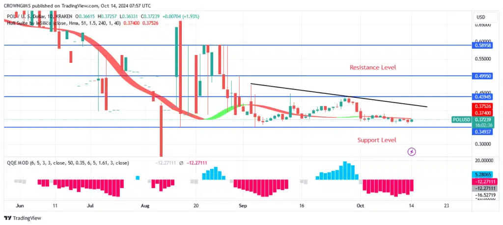 A POL’s four-hour inclination is shown. The price action that occurred last week around the $0.35 level resulted in the formation of a modest double bottom chart pattern on the 4-hour time frame. The downward trend reversed. Bulls took over the market from bears. The trend is moving toward $0.43, which would signal the conclusion of the negative period, despite sellers’ resistance