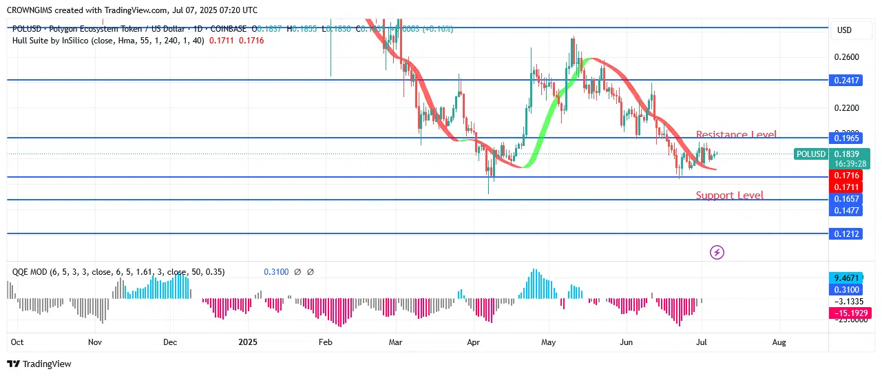 When POL is trading below the Hull Suite crypto signals indicator, bears are in control of the market. After breaking through the $0.19 barrier, POL (ex-MATIC) might be able to move on to the $0.21 and $0.24 difficulty levels. If sellers can generate some momentum, the market may be able to break through the $0.16 support level and expose itself to the $0.14 and $0.10 levels.