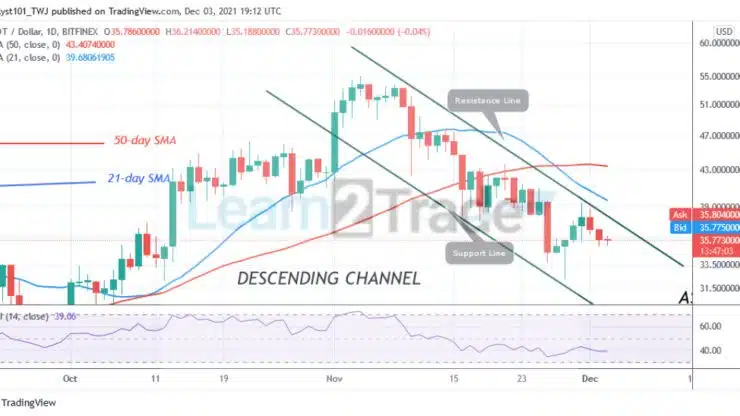 Polkadot’s (DOT) price is in a downward move as the altcoin declines to the oversold region of the market. As the altcoin fell to the low of $32, the bulls bought the dips. The upward correction terminated at the high of $38. DOT/USD is now in a downward correction as price fluctuates between $32 and $38. DOT price will resume upward if price breaks above the $38 high or above the moving averages. On the other hand, the selling pressure will resume, if price breaks below the $32 support.