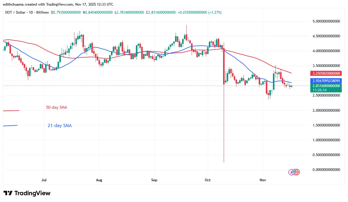 The 21-day and 50-day SMAs are horizontal due to a pause in the drop on November 4. The price bars are distinguished by Doji candlesticks, which dictate the price movements. On the 4-hour chart, the moving average lines are sloping downward, and the price bars are below the 21-day SMA. The 21-day SMA barrier causes the DOT price to decline.