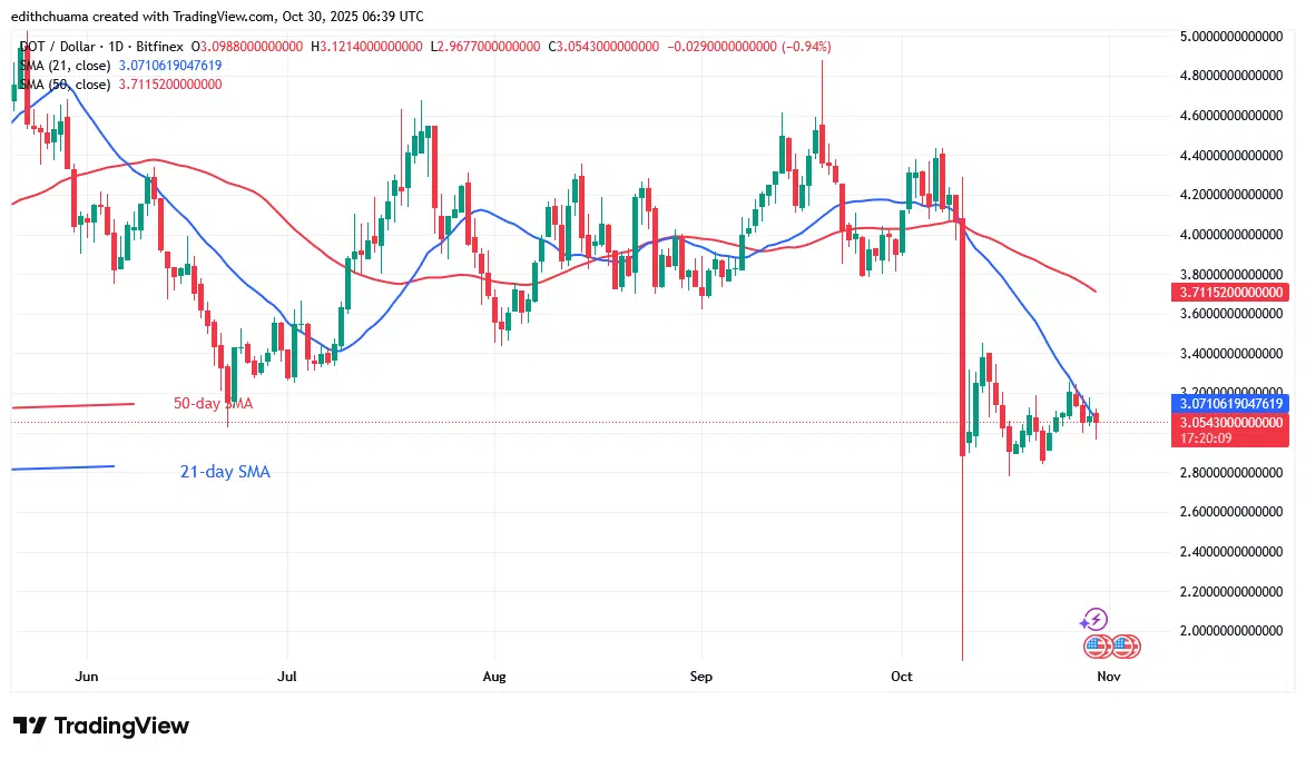Polkadot’s (DOT) price is falling but remains above its bottom price of $2.80. The crypto asset has been trading sideways above the $2.80 support and below the $3.40 resistance since October 11. Neither bulls nor bears have broken through the range-bound levels. Today, the DOT price is falling towards the $2.80 support. On the downside, the altcoin’s sideways movement will continue if it retraces and remains above the $2.80 support.