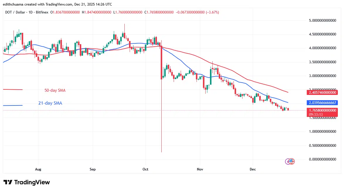 Polkadot’s (DOT) price reaches its bottom price of $1.70 after breaking below the critical support level of $2.00. Buyers wanted to push the price above $2.00, but were deterred by the recent high. Today, the altcoin has dropped to a low of $1.76, surpassing the bottom price level. On the downside, the cryptocurrency is anticipated to fall further to a low of $1.00. Later, the bearish momentum will extend to the October price level of $0.25. However, if the altcoin retraces and maintains above the $1.00 level, the upward trend may begin. In the meantime, the bearish momentum continues.