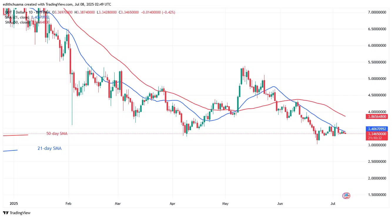 Polkadot’s (DOT) price has been stabilizing at the bottom of the chart amid traders’ disinterest. The negative trend has terminated above $3.02 support. The price movement has remained consistent above the $3.00 support and below the moving average lines.