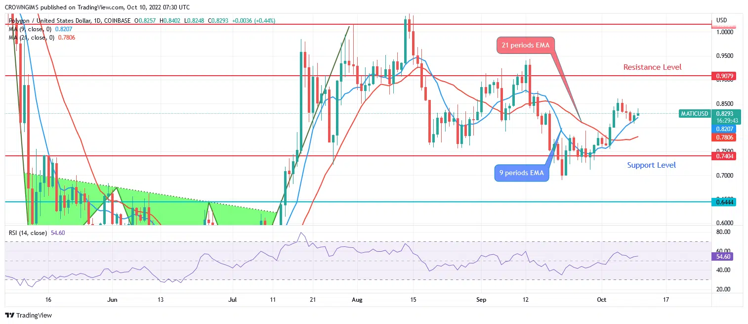 Polygon has penetrated the 9 periods EMA and 21 periods EMA upside. MATIC is trading above the two EMAs at the moment, which connote an increase in the bulls’ momentum. Further increase of the Polygon is highly envisaged. In case the resistance level of $0.90 is penetrated upside by the pressure of the bulls, the resistance level at $1.01 price level may be reached and may extend to the $1.18 level. An interruption of the bullish movement at $0.90 level may send the price towards support levels of $0.74, $0.64 and $0.55.