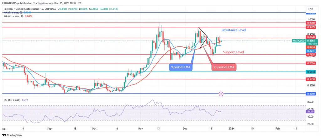 Polygon’s price is currently below both EMAs. The 9-day EMA is crossing above the 21-period EMA. The period 14 signal line of the relative strength index is at level 53, indicating a possible selling opportunity.