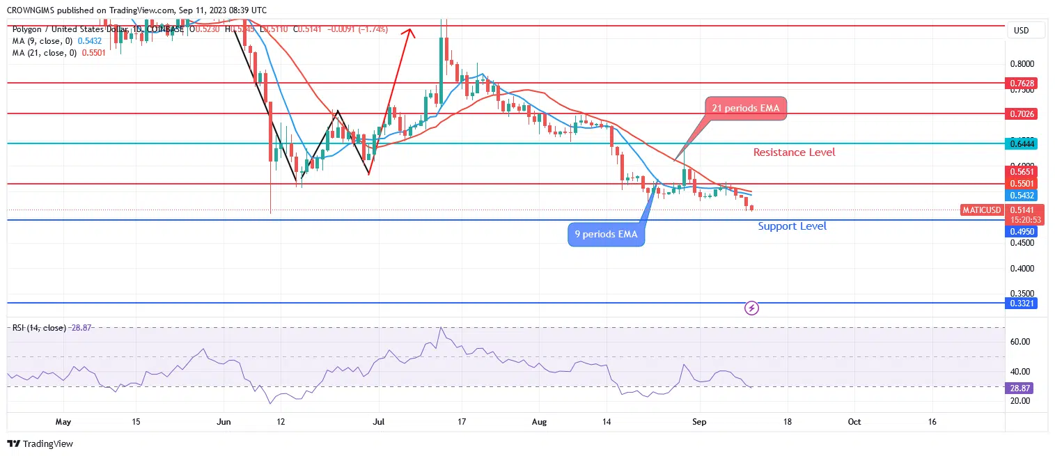 Selling is advised since MATIC is currently trading below both the 9- and 21-period exponential moving averages. Polygon must first get through the $0.56 resistance level before attempting to cross the $0.64 and $0.70 resistance levels. The market may move past the $0.49 support level and be exposed to the $0.33 and $0.27 levels if sellers are successful in unifying their forces.