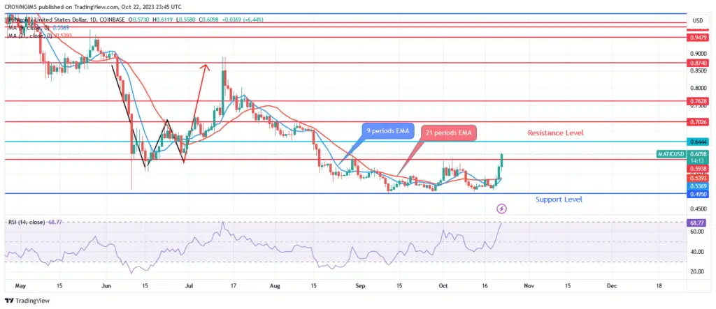 A polygon’s 4-hour inclination is shown. On the 4-hour time frame, the price action has constructed a double bottom chart pattern at $0.49 from the previous week. Retailers don’t seem to be able to lower the price below $0.49. The price increases and approaches the $0.64 threshold due to buyers’ pressure. The price is currently inclining since buyers are at odds with sellers at the previously indicated level.