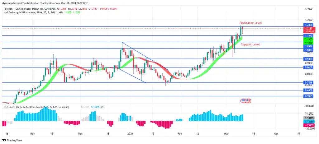 Polygon could be able to get beyond the $1.23 barrier and reach the $1.30 and $1.45 challenge levels. The market may breach the $1.15 support level and expose itself to the $1.09 and $1.03 levels if sellers gather some momentum.