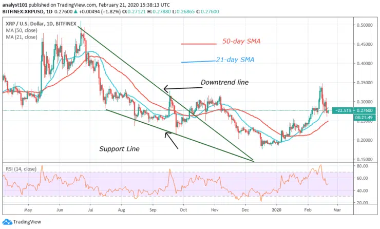 In the overbought region, buyers are not available to push the coin upward. However, sellers emerge in the region to push the coin downward. On the downside, Ripple has fallen to a low of $0.27. The price level has been a historical price for some time. The price level may hold or be broken