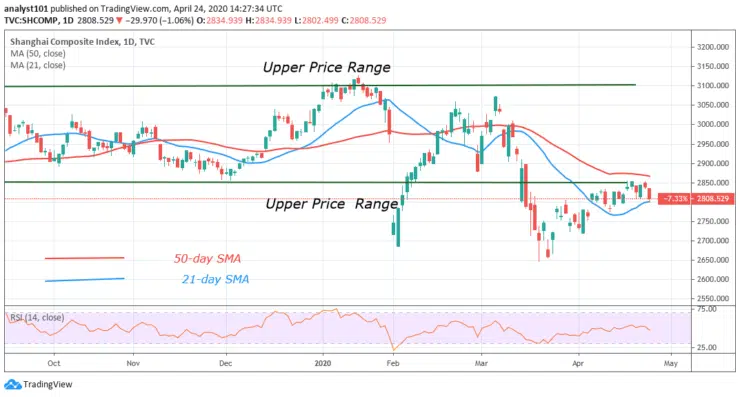 The SHCOMP index has been in a sideways move between 2850 and 3100. In March, the price fell to level 2650 ad then resumed an upward move. The bulls could not break above the lower price range as price fell to the support of the 21-day SMA. The index will move up to the range-bound zone if the 21-day SMA support holds. The index may continue the downward move, if the support cracks.