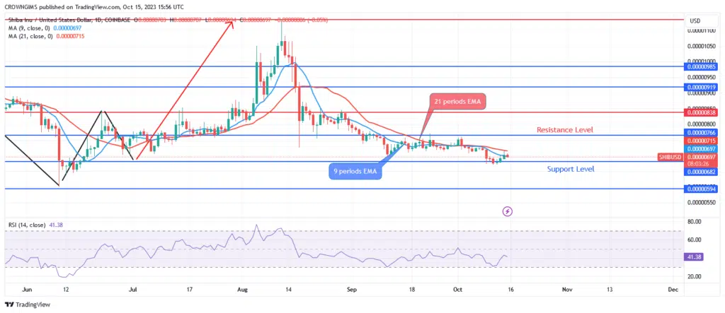 The 9- and 21-period exponential moving averages are now the areas where Shiba Inu prices are most volatile. A sell signal appears at 51 on the Relative Strength Index.