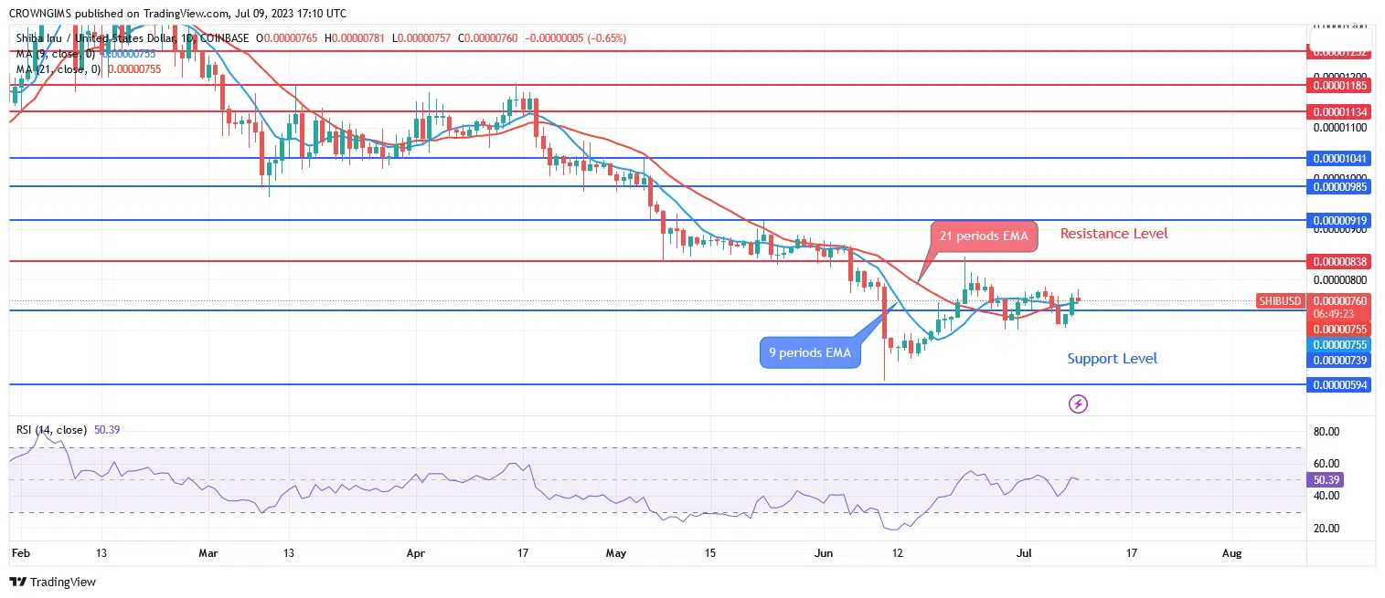 Shiba Inu is currently trading above the 9-period and 21-period exponential moving averages. The 55 levels of the Relative Strength Index suggest a negative trend.