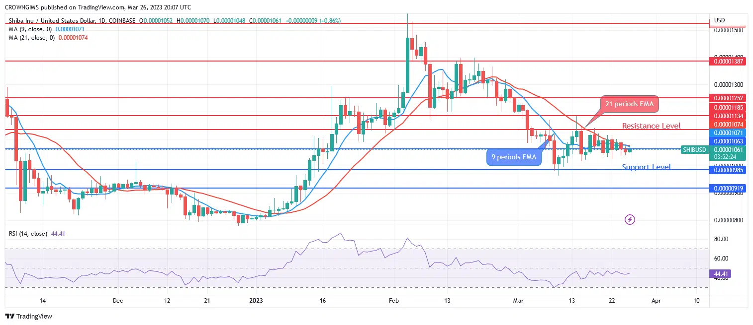 Shiba Inu is on the ranging movement in the daily chart. There was no significant movement in the Shiba Inu market. The resistance level of $0.0000108 holds and prevents further increases in price. Also, buyers’ momentum is weak and could not push the price above $0.0000108 level. The support level of $0.0000104 is withstanding further price decrease. Hence, the price is currently moving within $0.0000108 and $0.0000104 levels.