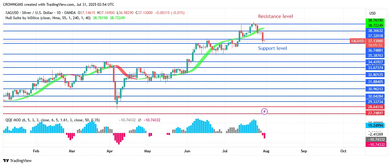 The price of silver is lower than the Hull Suite forex signals index, and the histogram is below zero. One of the best forex signal indicators, the QQE MOD, is currently displaying a negative signal. It will try to climb up into the $38–$39 range if the price is more than $39 and many people are buying it. However, the price of silver may drop and test the $34 and $33 support possibilities if merchandisers are able to hold onto the $37 pricing position and the $36 support position is broken.