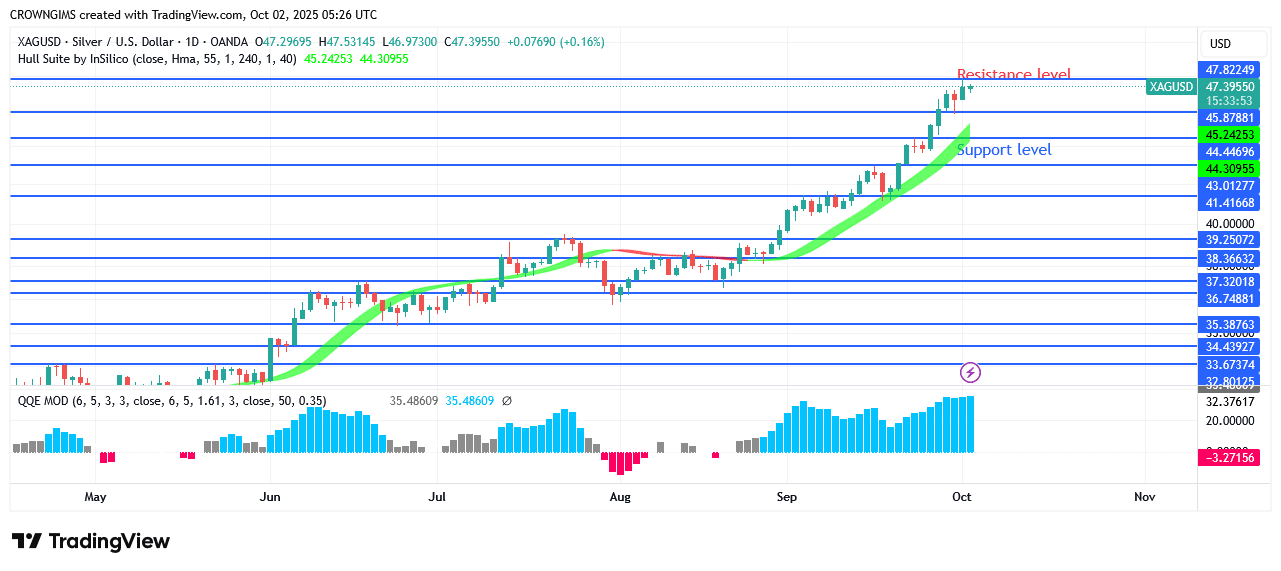 It will try to climb up into the $48–$49 zone if the price is more than $47 and many people buy it. The price of silver might drop and test the $45 and $44 support levels, nevertheless, if merchandisers can hold onto the $47 pricing stance and the $46 support position is broken.