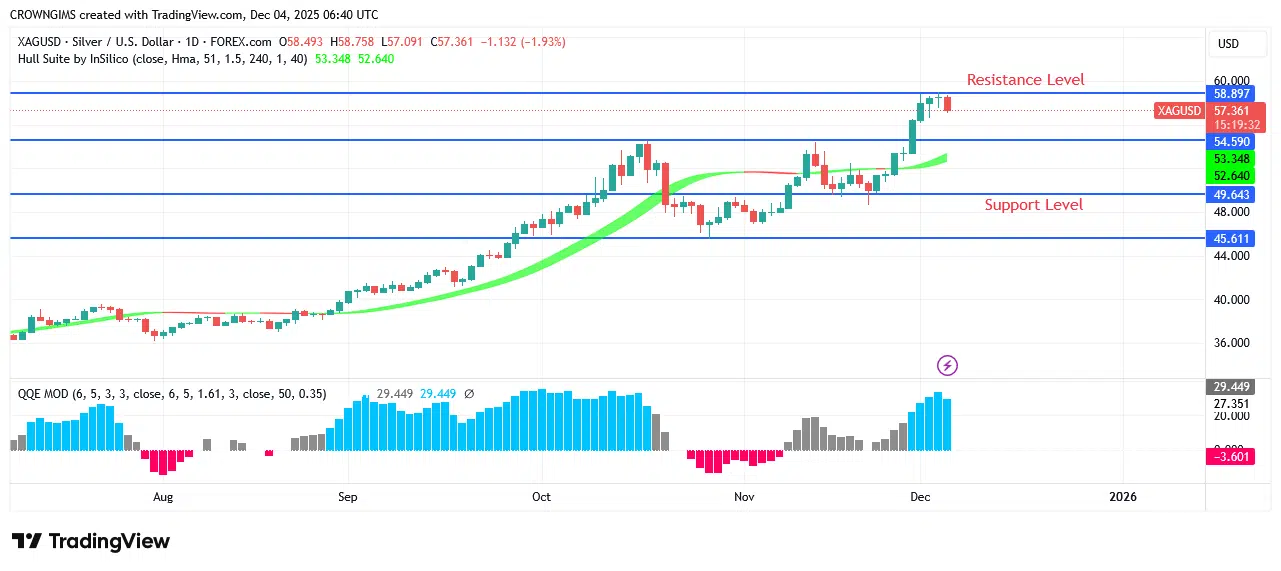 It will try to surge up into the $59–$60 zone if the price is greater than $58 and many people buy it. If merchandisers are successful in keeping the $58 pricing stance and the $57 support position is breached, the price of silver may decline and test the $56 and $55 support levels.