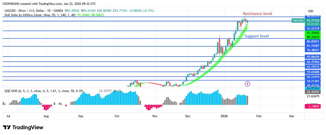 However, if sellers are able to hold the $93 price level and the $86 support is breached, the price of silver may drop and test the $81 and $69 support levels.