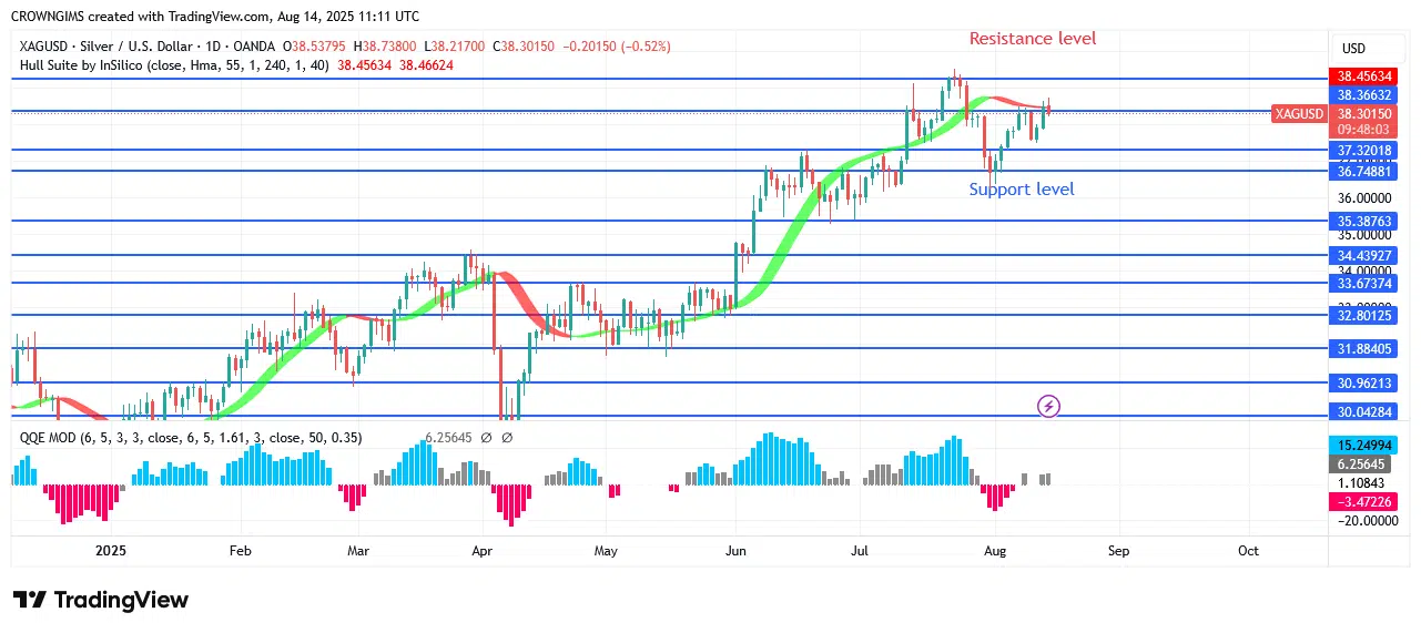 It will try to rise up into the $39–$40 zone if the price is higher than $38 and many people buy it. However, the price of silver may drop and test the $36 and $35 support possibilities if merchandisers are able to hold onto the $38 pricing position and the $37 support position is broken.