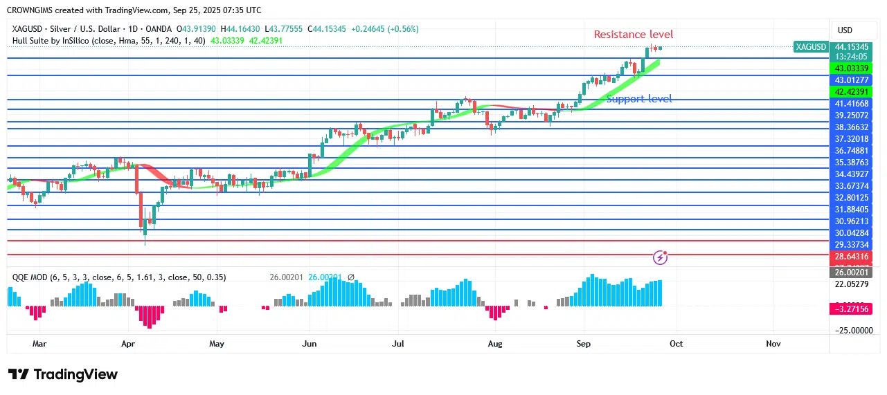 Silver’s price has a histogram above zero and is above the Hull Suite forex signals index. The QQE MOD, one of the top forex signal indicators, is showing a positive signal right now. If the price is higher than $44 and a lot of people purchase it, it will attempt to move up into the $45–$46 range. However, if merchandisers can maintain the $44 pricing posture and the $43 support position is broken, the price of silver may decline and test the $42 and $41 support levels.