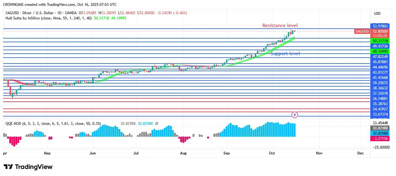 The price of silver is above the Hull Suite forex signals index and has a histogram above zero. One of the best forex signal indicators, the QQE MOD, is currently displaying a positive signal. It will try to rise up into the $53–$54 range if the price is greater than $52 and many people buy it. The price of silver may drop and test the $50 and $49 support levels, though, if merchandisers are able to hold onto the $52 pricing posture and the $51 support position is broken.