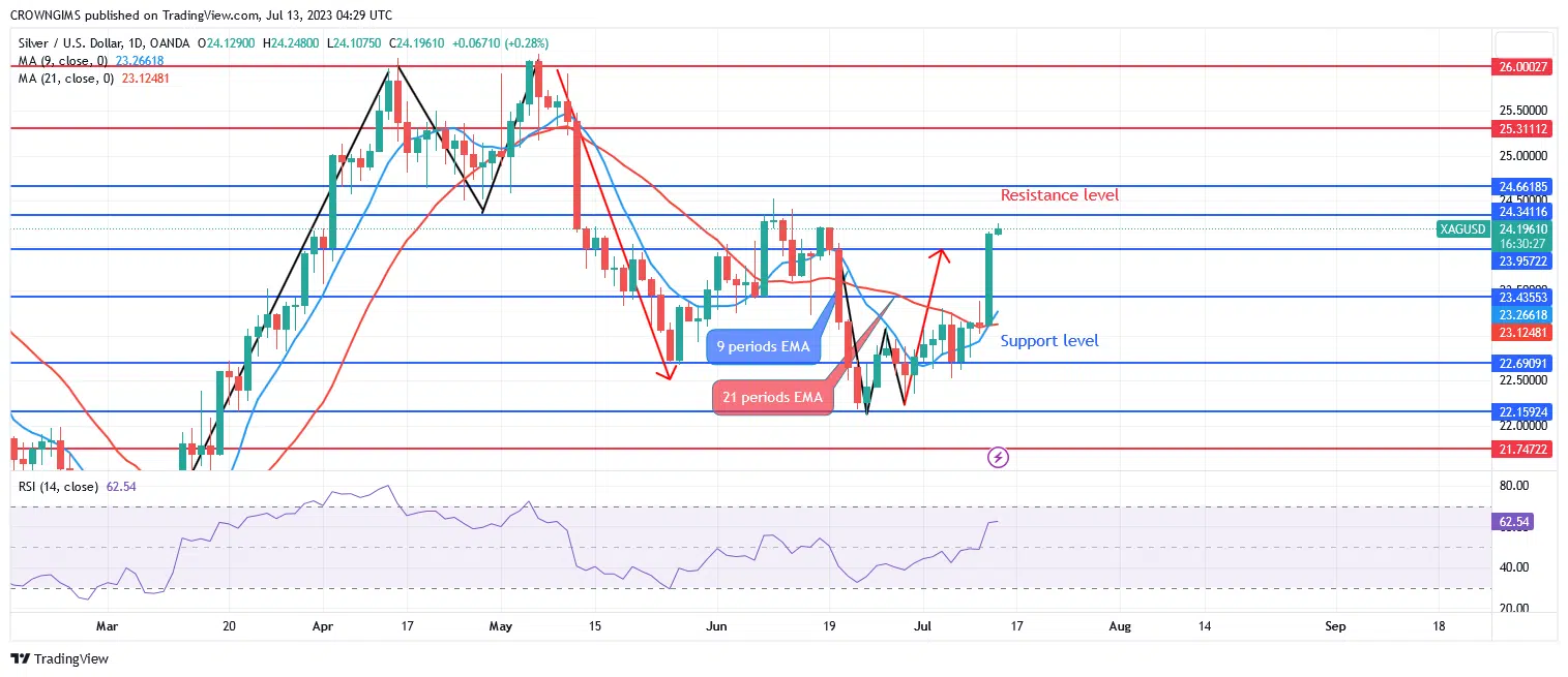 Silver’s 4-hour chart shows a bullish phase. This bullish reversal chart pattern, the double bottom, is plausible. The cost of white metal dropped to a low of $22 twice before starting to rise quickly. As buyers gained momentum, the previous resistance levels of $23 changed into support levels. The pricing is getting much more exorbitant as it gets closer to $24.