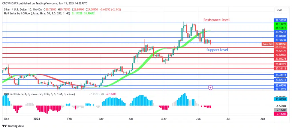 When the falling histogram is below zero, the price of silver may fall below the Hull Suite forex signals indicator. One of the best indicators for forex signals, the QQE MOD, is currently displaying a bearish signal. If there were significant buying activity and the price break $29, it would try to go into the $30–$31 zone. Silver’s price may drop and test the $27 and $26 support levels if sellers are able to hold the $29 price level and the $28 support level is breached.