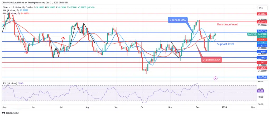 The price of silver is currently above the exponential moving averages (EMAs) with nine and twenty-one periods. The relative strength index’s period 14 signal lines are bending upward at point 63. If buyers can hold the $23 price level and the $24 resistance level is broken, silver’s price may rise and test the $25 and $26 resistance levels. A lower price breach of the $23 barrier would aim for the $22 and $21 zone in the event of strong selling pressure.