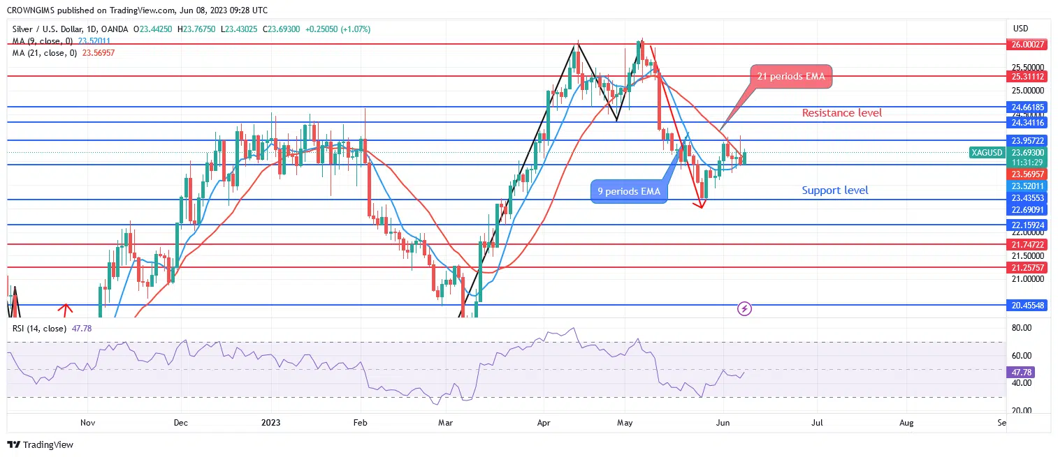 Once the $23 level is broken upward, the price resistance levels of $24 and $25 may be tested as demand increases. Silver may fall and test the $21 and $20 support levels if sellers are able to hold the $23 price level and the $22 support level is breached.