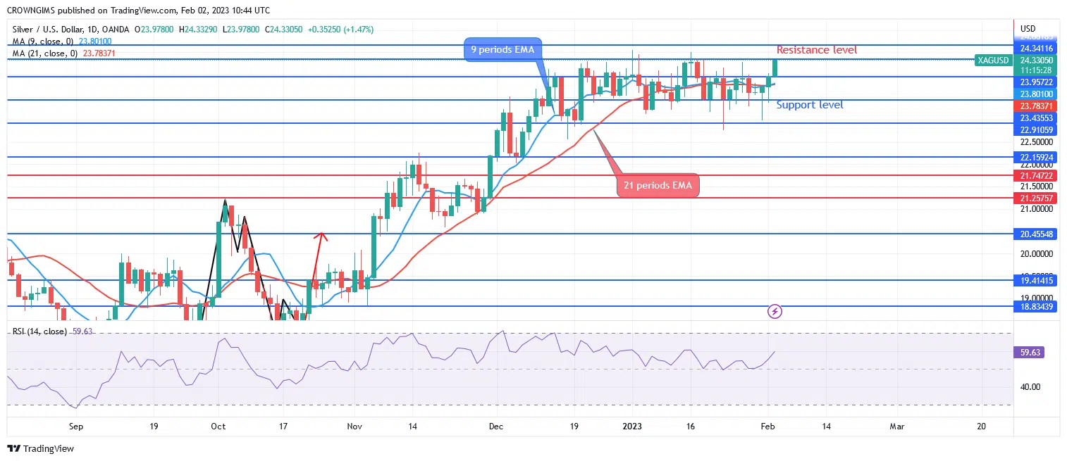 The silver price is still moving in close proximity to the 9-period and 21-period EMAs, which are connected to one another. A bullish signal may be seen at level 59 when the signal lines on the Relative Strength Index period 14 are showing a bullish direction. Silver’s price may rise, possibly hitting the $24.66 and $25.31 resistance levels, when bulls back the $23.43 price level and the $24.33 resistance level is breached. The price might drop to as low as $22.93 and $22.15, which would be below the $23.43 support level if sellers exert more pressure.