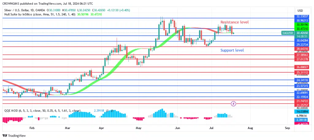 The histogram is skewed below zero in addition to the silver price being at the Hull Suite forex signals indicator. The QQE MOD, one of the strongest indicators for forex signals, is showing a bearish signal right now. Should a substantial quantity of purchasing activity occur and the price surpasses $31, it will endeavor to attain the $32–$33 bracket. If sellers are able to maintain the $31 price level and the $30 support level is broken, silver’s price may fall and test the $28 and $27 support levels.
