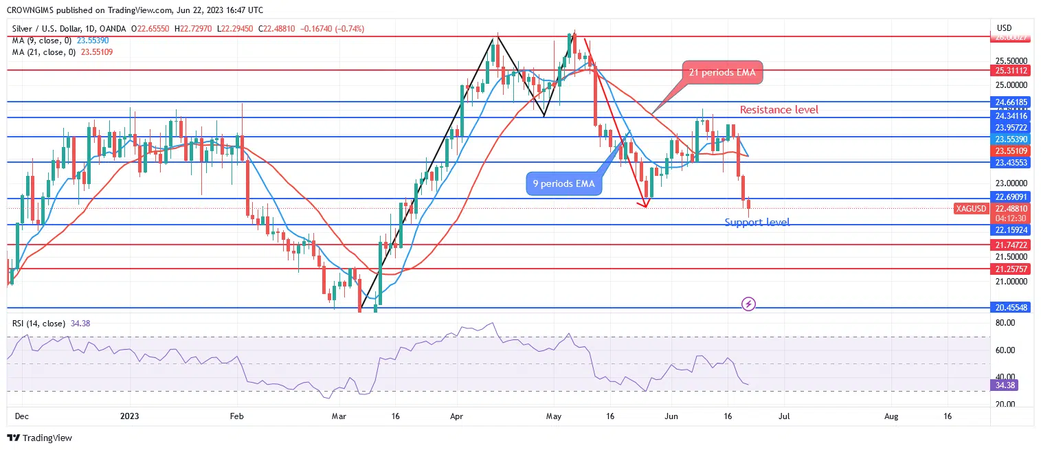 The white metal is trading in a negative trend below the 9-period and 21-period exponential moving averages while the fast EMA is crossing the slow EMA downward. A selling situation is indicated by the relative strength index period 14 signal lines heading downward at 24. In case demand increases once the $22 level is broken higher, the price resistance levels of $23 and $24 can be put to the test. Silver’s price may fall and test the $20 and $19 support levels if sellers are able to hold the $22 price level and the $21 support level is broken.