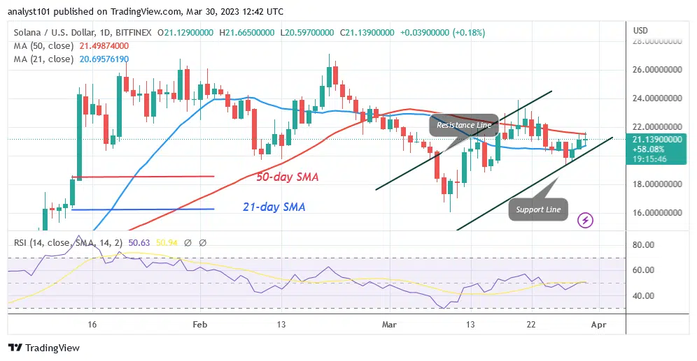 Solana’s (SOL) price has reversed its negative trend as it challenges the resistance at $22. Buyers are pushing the coin to recapture its previous highs of $24 and $26. On March 20, the bullish momentum was rejected at a high of $24 but fell to a low of $19. At the time of writing, the altcoin is currently trading at $21.09. On the upside, it will be difficult for buyers to surpass the previous high. Between the moving average lines, Solana is entrapped. If the price of Solana rises above the $24 resistance level and the 50-day SMA, the positive trend will resume. The bullish trend will continue up to the $26 high. But, if the altcoin stays pinned within the moving average lines, the bullish scenario will be invalidated.