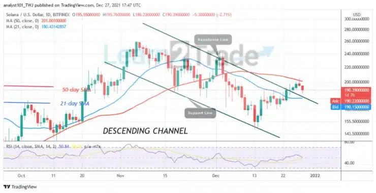 Solana’s (SOL) price has recovered from its downward move as altcoin hovers above $180 Support . The crypto’s price breaks above the 21-day line moving average but fails to break above the 50- day line moving average. If the bulls have broken above the moving averages, the cryptocurrency will be out of downward correction. The current upward move will be accelerated to the upside. The altcoin will revisit the previous highs of $240 and $260. However, today Solana is facing rejection at the 50-day line moving average. The bottom line is that the cryptocurrency will be compelled to fluctuate between the 21-day line and the 50-day line moving averages.