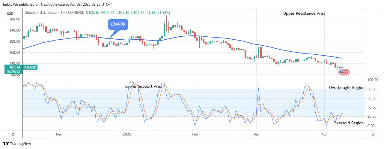 Hence, after completing the lows, the SOLUSD price moved to a $107.76 high level below the EMA-50 as a pullback as the daily chart resumes today, heading towards the peak high value, due to more concerns from the buy investors.