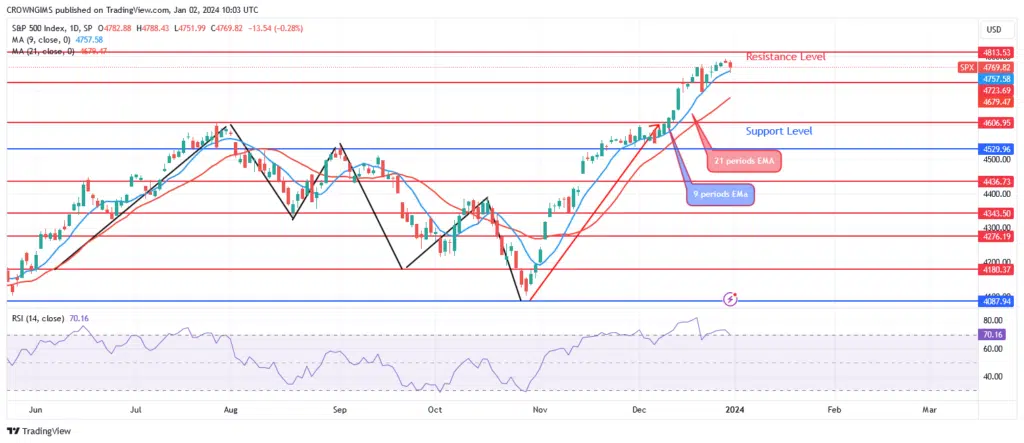 S&P 500 can go quickly into the resistance levels of $4813, $4900, and $5000 if the $4723 level is held. The 70 rating on the period 14 relative strength index and the inclining trend of the signal line both point to a buy. The overall expenditure can be more than $4900.