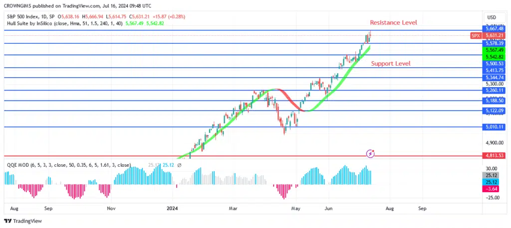 If the $5580 level holds, the S&P 500 may rise and split into the resistance levels of $5667, $5680, and $5710. The $5499 and $5413 support levels may be tested by the price if the $5580 support level is destroyed. Both the Hull Suite crypto signals and the QQE MOD histogram suggest a buy. Maybe it will keep going in the right direction
