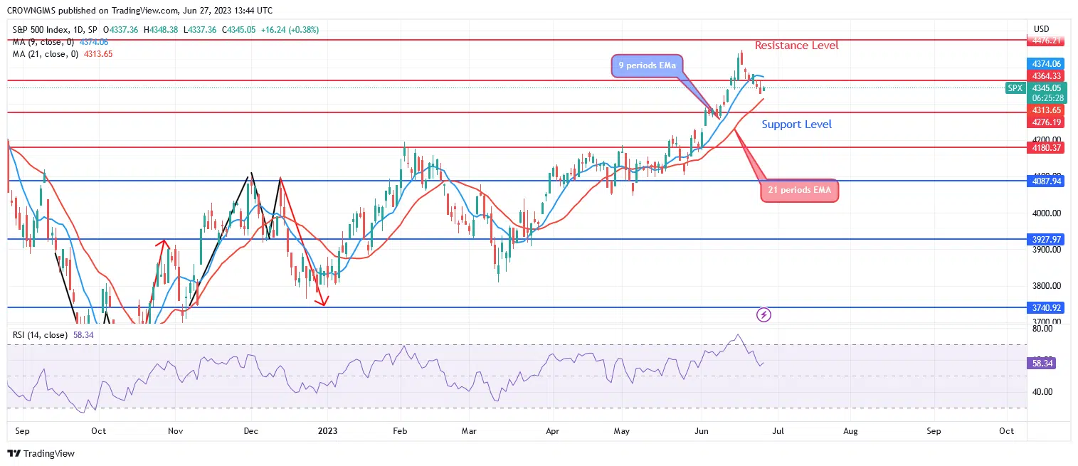 As selling pressure increases, the S&P 500 may break below the $4276 support level, and further, selling could drive the price down to the $4180 and $4087 levels. The price may revert and rise in the direction of the resistance levels of $4364, $4476, and $4631 if the $4276 support level is held. The relative strength index period 14 is at 58 and the signal line heading downward indicates a sell signal.