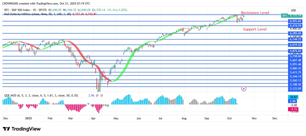The S&P 500 may touch the resistance levels of $6591, $6764, and $6820. This is assuming that the $6470 position stays steady. The price may test the $6284 and $6155 possibilities if it breaches the $6470 support level. Both the Hull Suite crypto signals and the QQE MOD histogram point to a purchase. It may all go according to plan.