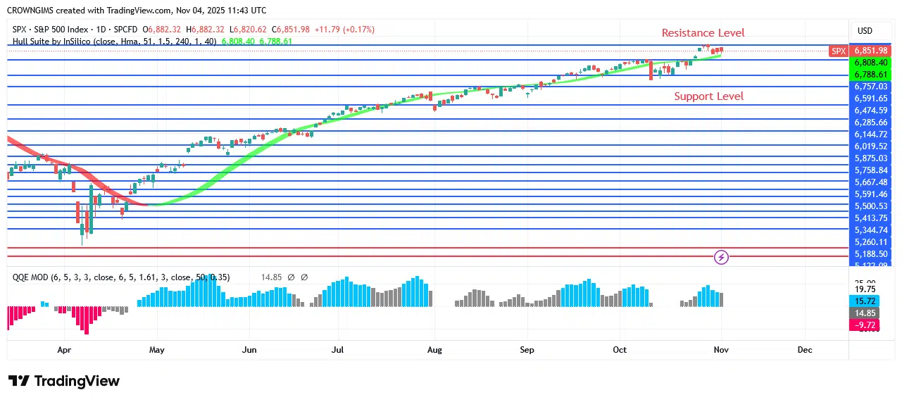 The S&P 500 may touch the resistance levels of $6906, $6950, and $7020. This is assuming that the $6757 position stays steady. The price may test the $6589 and $6473 possibilities if it breaches the $6757 support level. Both the Hull Suite crypto signals and the QQE MOD histogram point to a purchase. It may all go according to plan.