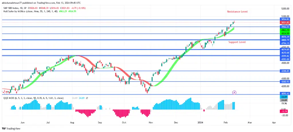 The S&P 500 may advance quickly into the resistance levels of $5054, $5066, and $5500 if the $4966 level is maintained. The Hull Suite signal and the QQE MOD histogram both point to a purchase. It is possible to spend more than $5054 in total