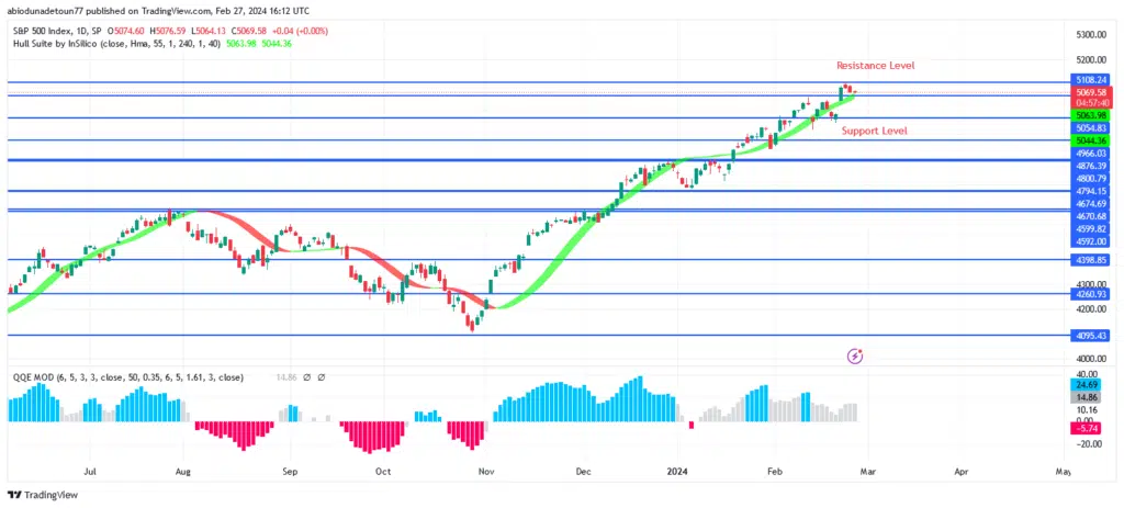 S&P 500 can rise quickly into the resistance levels of $5108, $5166, and $5500 if the $5068 level holds. A purchase is indicated by the Hull Suite signal as well as the QQE MOD histogram. It is possible to spend more than $5108 in total.