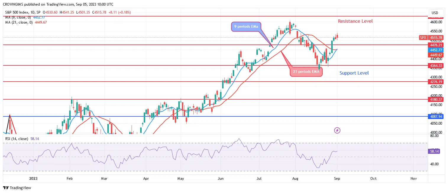 On the daily chart, the S&P 500 is moving in a bullish direction. Last month, the price of the S&P market was under the control of the buyers. The bullish movement surpassed the $3631 resistance level and peaked at $4631 when there was buying pressure. The bulls’ impetus wore out because sellers defended the $4631 level. S&P 500 pulled back and retested the support level of $4364. Sellers’ pressure failed at the just mentioned level. At the moment, bulls are dominating the market and it is targeting the previous high at $4631 level.