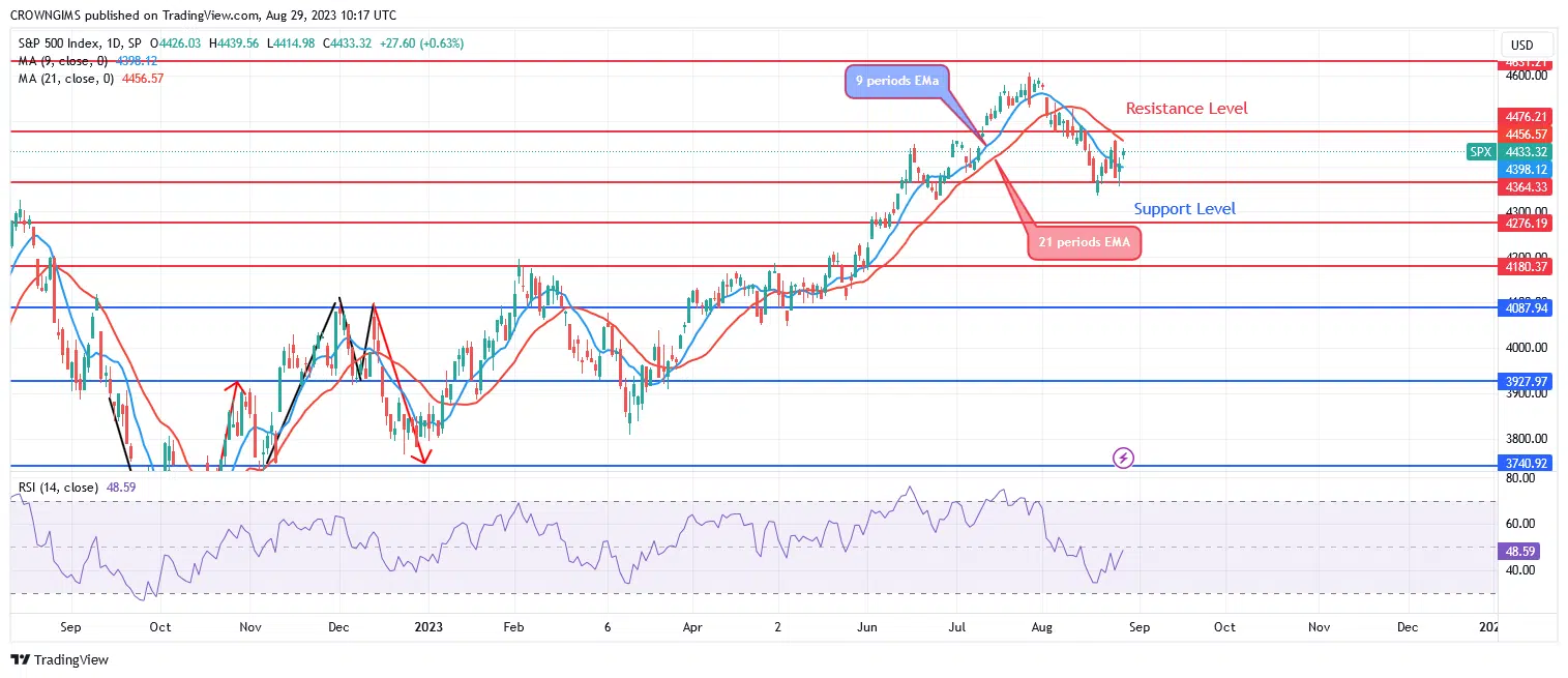 On the daily chart, the S&P 500 is moving in the bearish direction. The price of the S&P market was able to surpass the $3631 resistance level and peak at $4631 when there was buying pressure. Bulls’ impetus wore out because they were unable to raise the price over the previous level. Beginning on July 27, increasing negative pressure burst past the $4476 barrier. As a result of increasing negative pressure, the price is currently reversing in the direction of the $4364 support level.