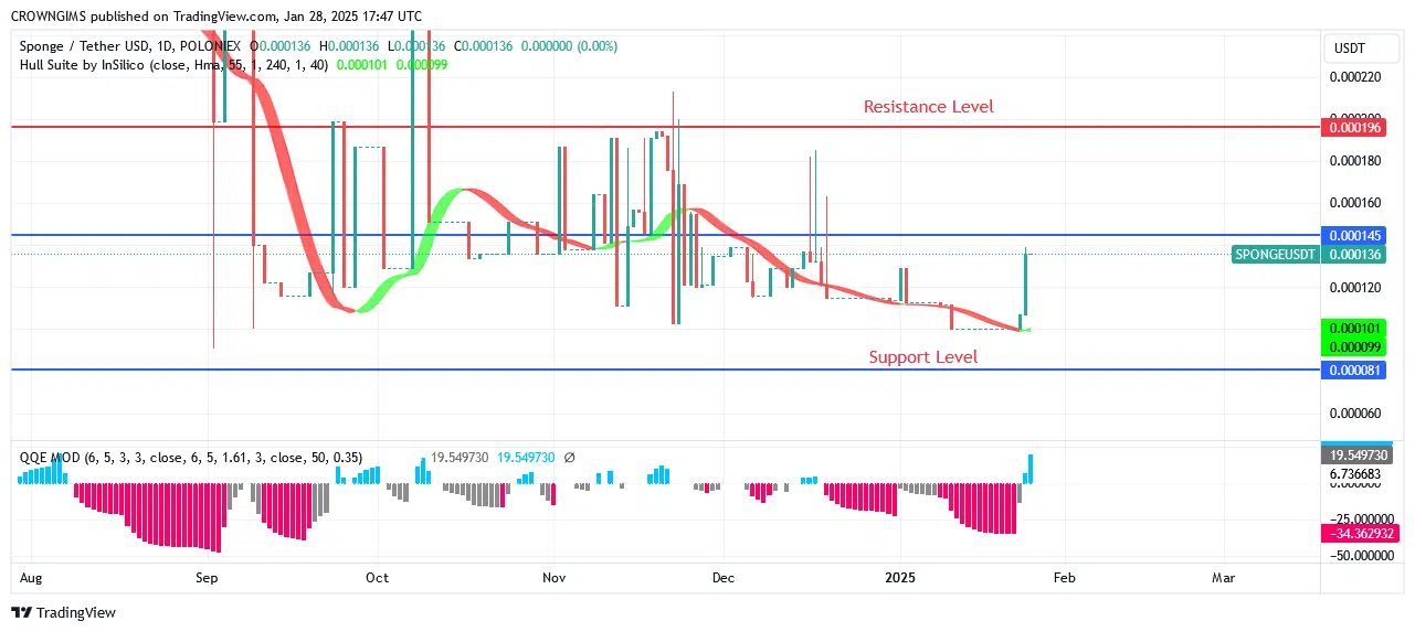 If SPONGE breaks over the $0.000145 resistance level, which is followed by the $0.000196 and $0.000330 barrier levels, bullish momentum will pick up speed. If the bulls keep pushing the price, it can surpass the previously indicated level.