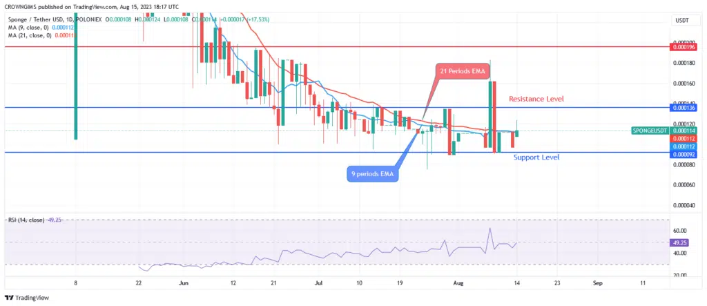 In case the resistance level of $0.000136 does not hold, the Bulls may drive the coin up after the pullback to penetrate the $0.000196 level and aim for $0.000330. Sponge may remain in consolidation if the previously indicated level holds