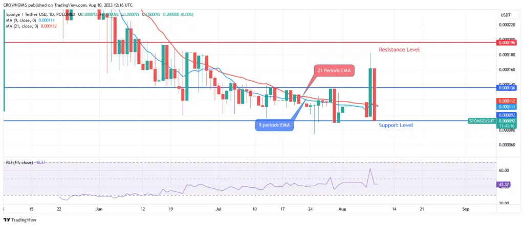 If the bulls apply further pressure and break over the $0.000136 level, Sponge will move through the $0.000196 and $0.000330 resistance levels. The daily chart’s level 40 on Period 14’s relative strength index shows that this week is most likely to see further positive activity.
