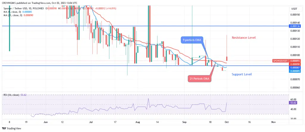 On the 4-hour chart, SPONGEUSDT’s price is increasing. The Coin is rising as more bullish candles continue to form from its support level of $0.000087. The interest of buyers in the sponge market will lead to the breaking of the resistance level of $0.000136. The $0.000196 barrier level may be broken through if bullish pressure increases.