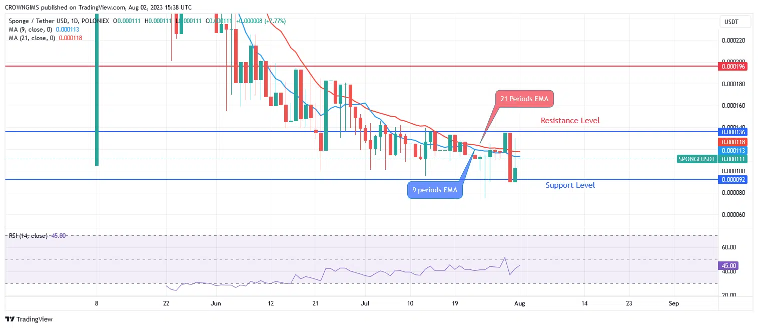The fact that Sponge is currently circling the 9-period EMA and the 21-period EMA shows that the bullish momentum is intensifying. The relative strength index period 14 is at 45 levels and is going north, which indicates a buy signal. The $0.000136 resistance level may be overcome by Sponge, allowing it to attack the $0.000196 and $0.000330 levels if the Bulls continue to exert pressure.