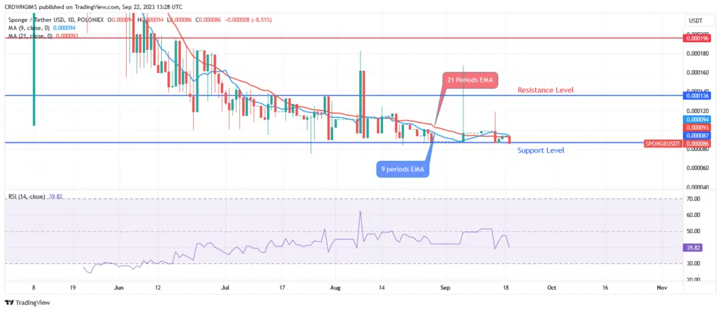 As long as the bulls are able to hold onto the $0.000087 support level, Sponge will rise and surpass the $0.000136, $0.000196, and $0.000330 resistance levels. The $0.000006 and $0.000004 levels could be reached if the bears break through the $0.000087 support.